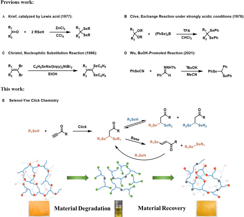 Abstract: The emergence of covalent adaptable networks (CANs) based on dynamic covalent bonds (DCBs) presents a promising avenue for achieving resource recovery and utilization. In this study, we discovered a dynamic covalent bond called selenacetal, which is obtained through a double click reaction between selenol and activated alkynes. Density functional theory (DFT) calculations demonstrated that the ΔG for the formation of selenoacetals ranges from 12 to 18 kJ mol−1, suggesting its potential for dynamic reversibility. Dynamic exchange experiments involving small molecules and polymers provide substantial evidence supporting the dynamic exchange properties of selenoacetals. By utilizing this highly efficient click reaction, we successfully synthesized dynamic materials based on selenoacetal with remarkable reprocessing capabilities without any catalysts. These materials exhibit chemical recycling under alkaline conditions, wherein selenoacetal (SA) can decompose into active enone selenide (ES) and diselenides. Reintroducing selenol initiates a renewed reaction with the enone selenide, facilitating material recycling and yielding a newly developed dynamic material exhibiting both photo- and thermal responsiveness. The results underscore the potential of selenoacetal polymers in terms of recyclability and selective degradation, making them a valuable addition to conventional covalent adaptable networks.