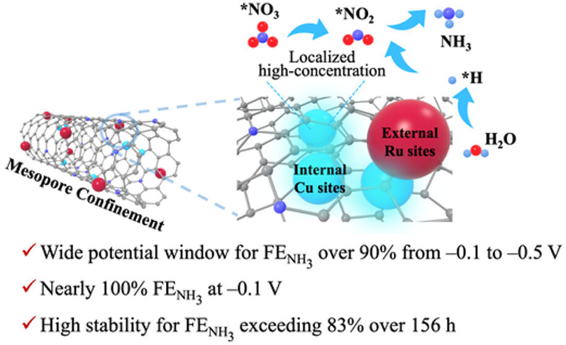 Abstract: Nitrate (NO3–) in wastewater poses a serious threat to human health and the ecological environment. The electrocatalytic NO3– reduction to ammonia (NH3) reaction (NO3–RR) emerges as a promising carbon-free energy route for enabling NO3– removal and sustainable NH3 synthesis. However, it remains a challenge to achieve high Faraday efficiencies at a wide potential window due to the complex multiple-electron reduction process. Herein, spatially separated dual-metal tandem electrocatalysts made of a nitrogen-doped ordered mesoporous carbon support with ultrasmall and high-content Cu nanoparticles encapsulated inside and large and low-content Ru nanoparticles dispersed on the external surface (denoted as Ru/Cu@NOMC) are designed. In electrocatalytic NO3–RR, the Cu sites can quickly convert NO3– to adsorbed NO2– (*NO2–), while the Ru sites can efficiently produce active hydrogen (*H) to enhance the kinetics of converting *NO2– to NH3 on the Cu sites. Due to the synergistic effect between the Cu and Ru sites, Ru/Cu@NOMC exhibits a maximum NH3 Faradaic efficiency (FENH3) of approximately 100% at −0.1 V vs reversible hydrogen electrode (RHE) and a high NH3 yield rate of 1267 mmol gcat–1 h–1 at −0.5 V vs RHE. Finite element method (FEM) simulation and electrochemical in situ Raman spectroscopy revealed that the mesoporous framework can enhance the intermediate concentration due to the in situ confinement effect. Thanks to the Cu–Ru synergistic effect and the mesopore confinement effect, a wide potential window of approximately 500 mV for FENH3 over 90% and a superior stability for NH3 production over 156 h can be achieved on the Ru/Cu@NOMC catalyst.