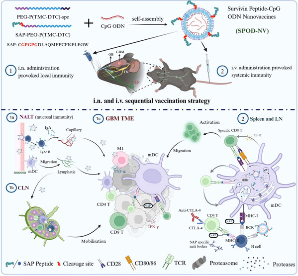 Abstract: Peptide vaccines hold great promise for treatment of glioblastoma (GBM), though their efficacy remains suboptimal due to factors such as immunosuppressive tumor microenvironment, poor accessibility to tumor site and inadequate activation of antigen-presenting cells. Here, this work reports on survivin peptide-CpG oligodeoxynucleotide (ODN) nanovaccines (SPOD-NV), which feature antigen peptides strategically displayed on polymersomes with CpG ODN encapsulated as an immunostimulatory adjuvant. Sequential administration via intranasal and intravenous routes elicits robust immune response against murine GBM. These results demonstrate that SPOD-NV significantly enhances mucosa penetration and markedly improves dendritic cell uptake and activation. Notably, the intranasal administration of SPOD-NV to orthotopic murine GL261 tumor models reveals marked accumulation in cervical lymph nodes and tumors, likely facilitated by lymphatic transport from nasal mucosa and pathways via olfactory bulb and trigeminal nerve, bypassing the blood-brain barrier. Interestingly, the therapeutic strategy, comprising three intranasal and two intravenous administrations of SPOD-NV in combination with anti-CTLA-4 antibody, results in substantial tumor inhibition, achieving a 43% complete regression rate, in line with the stimulation of robust and long-lasting local and systemic anti-GBM immune responses. These intranasal-intravenous administration strategy of peptide-CpG nanovaccines provides a potential curative therapy for brain tumors, paving the way for further developments in GBM immunotherapy.