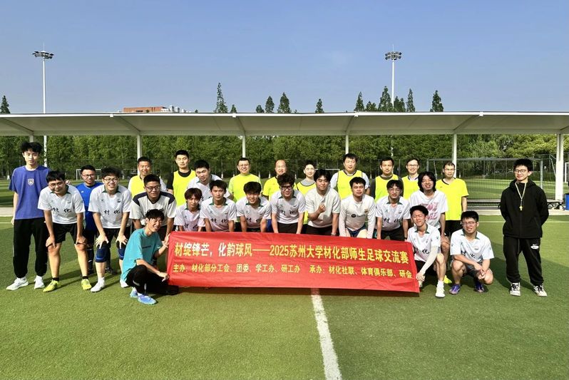 为丰富材化学子的业余文化生活,落实“体心融合”方案,增进师生情谊,展现学部师生团结友爱、积极向上的精神风貌,引领师生积极参加体育锻炼,材化部分工会、团委、学工办、研工办于2025年5月7日在独墅湖一期足球场联合举办了“材绽锋芒,化韵球风”——2025苏州大学材化部师生足球交流赛。