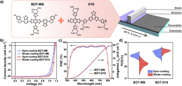 Abstract: Enabling large-area deposition of dopant-free organic hole transport layers (HTLs) with high reproducibility and uniformity is crucial for fully printed n-i-p perovskite solar cell (pero-SC) modules. However, typical polymer hole transport materials (HTMs), with non-Newtonian fluid characteristics, show shear rate-dependent viscosity during the printing process, whereas blade-coated small-molecule HTLs often exhibit unfavorable assembly behavior and solute random distribution caused by molecular aggregation and low viscosity; these factors impose challenges on blade-coating of high-quality large-area HTL films. Here, we designed a dopant-free small molecule BDT-MB with high mobility and further proposed a molecular cooperative (MC) strategy by combining with polymer D18. The mechanism was clearly clarified that the pre-aggregated polymer D18 acted as a “seed crystal” to induce preferential face-on orientation of small molecule BDT-MB through intermolecular C─H···π interaction. This strategy not only suppresses the unfavorable assembly behavior of small molecular HTMs but also overcomes the solute random distribution by tuning the solution with high and constant viscosity. It facilitates printing large-area dopant-free HTLs with high uniformity and ordered fiber-like morphology. The resultant small-area pero-SCs (0.062 cm2) and large-area fully printed modules (15.64 cm2) both achieved record power conversion efficiencies (PCEs) of 24.46% (certified at 24.30%) and 21.04%.