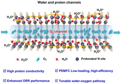Abstract:Proton exchange membrane fuel cells (PEMFCs) have gained significant attention due to their high efficiency and clean emissions. However, reducing platinum (Pt) loadings in PEMFCs remains challenging due to the high mass transport resistance near the catalyst surfaces. This study investigates phosphorylated covalent organic frameworks (P-rCOFs) as ionomers in PEMFCs, aiming to optimize the three-phase interface at the catalyst surface. Through the protonation of tertiary amine sites and precise structural engineering of side chains within the COF framework, well-defined transport channels are created to enhance water and oxygen mass transfer. The results demonstrate that P-rCOF-C4 significantly improves the catalytic performance of commercial Pt/C catalysts, with a half-wave potential 37 mV higher than Nafion. Furthermore, a PEMFC incorporating P-rCOF-C4 as an ionomer binder achieves a peak power density of 2.40 W cm-2 at 0.1 mg cm-2 catalyst loading, a 1.5 fold increase over Nafion. This work underscores the potential of P-rCOFs in optimizing the three-phase interface, offering a promising pathway for more efficient and cost-effective PEMFCs.