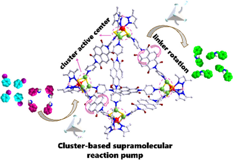 Abstract: Although discrete self-assembled cage compounds with single-metal centers mimicking natural bioreactors for catalysis have been extensively investigated, studies on those with multimetal active centers, i.e., cluster active centers (CACs), have been less explored. Herein, we present the design and synthesis of a novel cluster-based supramolecular reaction pump (CSRP-1) featuring four CACs that facilitate catalysis.CSRP-1 holds a cationic supramolecular tetrahedral structure, comprising four WS3Cu3 clusters, each positioned at one vertex and interconnected by dipyridyl linkers. Substrates, including aryl iodides or primary or secondary amines, enter the cage cavity by replacing N,N-dimethylformamide at the CACs through weak Cu···I/N interactions. This design leverages the coordinatively unsaturated Cu centers within each CAC to activate the substrates, resulting in efficient catalytic amination. CSRP-1 works like a dynamic pump, and upon completion of the reaction, the amine product is expelled from the cavity, allowing the catalytic cycle to repeat with maintained efficiency. Theoretical calculations complement the experimental findings, providing key insights into the catalytic mechanism and the synergistic role of the clusters and linkers. This work offers a new catalysis paradigm with broad applicability to various organic reactions.