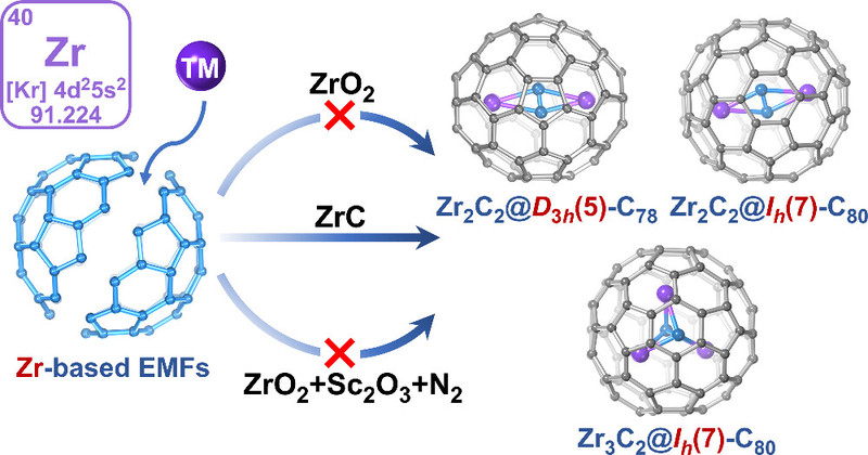Abstract: Zirconium-based endohedral metallofullerenes (EMFs) were first detected in the gas phase in 1992, but their bulk synthesis has remained elusive over the past three decades. Herein, we present the first successful synthesis of Zr-based EMFs, addressing this longstanding challenge in fullerene chemistry. By utilizing an optimized synthesis strategy with zirconium carbide as the metal source, we obtained three Zr-based carbide clusterfullerenes, namely, Zr2C2@D3h(5)-C78, Zr2C2@Ih(7)-C80, and Zr3C2@Ih(7)-C80. Single-crystal X-ray diffraction analyses revealed that the Zr2C2 clusters adopt a planar rhombic configuration bridged by a (C≡C)2– unit, while the Zr3C2 cluster exhibits a rare trifoliate geometry with a bridging (C–C)6– unit. The coordination modes in these Zr-based clusters are different from those observed in conventional organozirconium complexes, highlighting the unique coordination environments within fullerene cages. Combined experimental and theoretical studies further reveal the electronic structures of the Zr-based EMFs as (Zr2C2)6+@(C2n)6– (2n = 78, 80) and (Zr3C2)6+@(Ih(7)-C80)6–. This breakthrough in the synthesis of Zr-based EMFs not only offers new insights into the mechanisms of arc-discharge reaction and the formation of EMFs but also provides a substantial guideline for the encapsulation of new elements into fullerene cages, establishing a foundation for the design and synthesis of novel EMFs.
