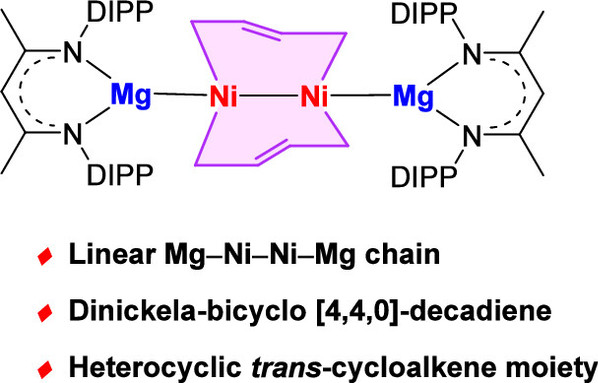 Abstract: Transition metal–diene complexes constitute a fundamental class of organometallic compounds, in which conjugated dienes typically behave as neutral π-donor ligands. While doubly reduced enediyl derivatives have been occasionally documented in the literatures, dinuclear transition metal complexes featuring such bonding motifs have not been explored. Herein, we report a heterometallic complex [(LMg)2Ni2(C4H6)2] (L = [(DIPPNCMe)2CH]−, DIPP = 2,6-iPr2C6H3) featuring a linear Mg-Ni-Ni-Mg bonded chain, which was formed by the reaction of LMgBu·Et2O with Ni(cod)2 (cod: 1,5-cyclooctadiene). Experimental and computational studies reveal two s-trans-butadiene ligands bridging the Ni–Ni bond in a doubly reduced enediyl configuration. This unique bonding arrangement results in a dinickela-bicyclo[4,4,0]-decadiene framework containing a heterocyclic trans-cycloalkene moiety. Treatment of [(LMg)2Ni2(C4H6)2] with the additional butadiene afforded [(LMg)2Ni2(C4H6)3], involving three C4H6 ligands bound to nickel centers, in which they behave as two doubly reduced enediyl ligands and one neutral butadiene ligand. In contrast, upon exposure to carbon monoxide (CO), a ligand exchange reaction occurred, yielding [(LMg)2Ni2(C4H6)(CO)4] with one C4H6 ligand, which is considered as a dinickelacyclo-4-hexene supported by Mg-metalloligands.