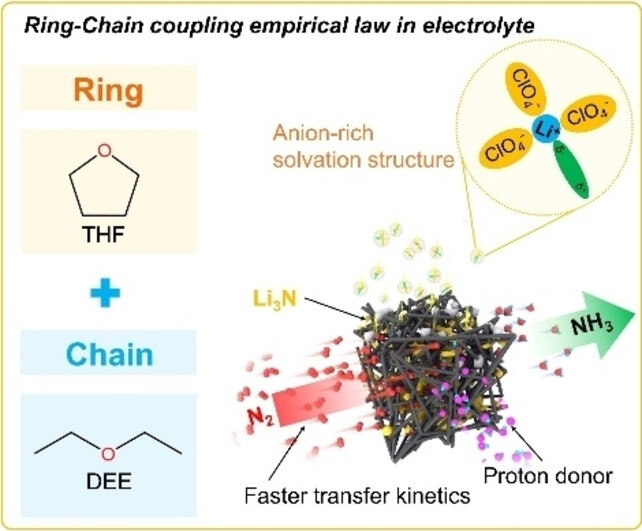 Abstract: With its efficient nitrogen fixation kinetics, electrochemical lithium-mediated nitrogen reduction reaction (LMNRR) holds promise for replacing Haber-Bosch process and realizing sustainable and green ammonia production. However, the general interface problem in lithium electrochemistry seriously impedes the further enhancement of LMNRR performance. Inspired by the development history of lithium battery electrolytes, here, we extend the ring-chain solvents coupling law to LMNRR system to rationally optimize the interface during the reaction process, achieving nearly a two-fold Faradaic efficiency up to 54.78 ± 1.60%. Systematic theoretical simulations and experimental analysis jointly decipher that the anion-rich Li+ solvation structure derived from ring tetrahydrofuran coupling with chain ether successfully suppresses the excessive passivation of electrolyte decomposition at the reaction interface, thus promoting the mass transfer of active species and enhancing the nitrogen fixation kinetics. This work offers a progressive insight into the electrolyte design of LMNRR system.