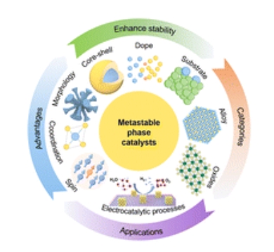 Abstract: Metastable-phase catalysts have emerged as a promising class of materials thanks to their excellent catalytic performance, stemming from their high Gibbs free energy, unique electronic structures, specific morphologies, and distinctive coordination environments. However, the development of metastable-phase catalysts still face great challenges due to their native thermodynamical instability, calling for innovative synthetic methods and catalyst design strategies. This review focuses on the advantages, stability enhancement strategies, main categories, and diverse applications of metastable-phase catalysts. We begin with the advantages of metastable-phase materials for designing high-performance catalysts, followed by a discussion of the latest advancements in stabilizing these materials through low-dimensional strategies, doping, core–shell structures, substrate effects and high-entropy strategies. Subsequently, we systematically classify and discuss in detail the structures and properties of several recently discovered metastable-phase materials. In addition, we examine their applications in electrocatalysis, hydrogenation and dehydrogenation reactions, as well as other applications. Finally, we provide insights into the future research directions to unlock the full potential of metastable-phase materials.