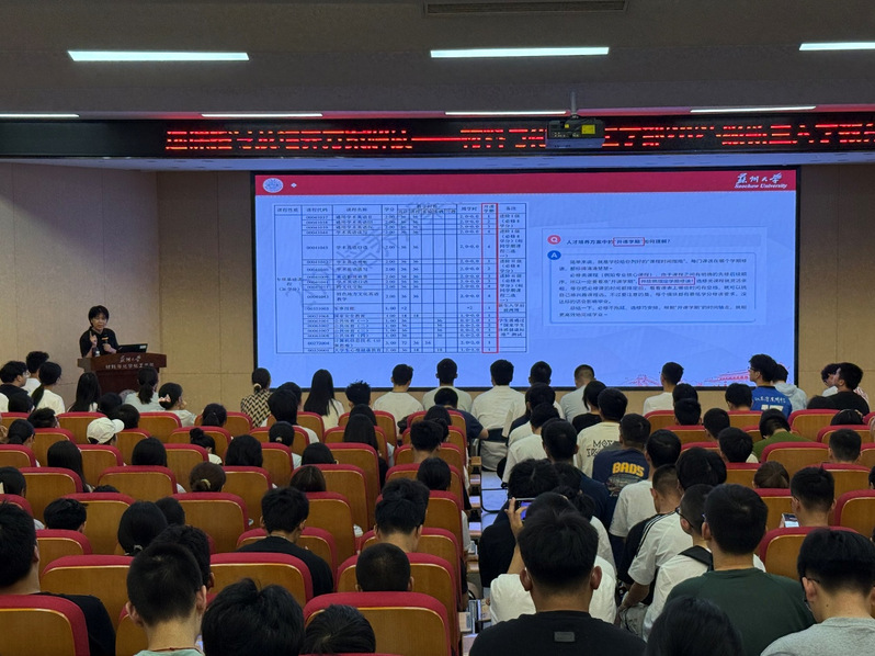 郭文娟老师强调,所有课程均须由学生通过选课系统自主完成,不存在代选或强制加课。她借助图表清晰演示选课流程,并提醒同学们严格对照培养方案,避免错选或漏选,充分体现了苏大严谨治学的传统。