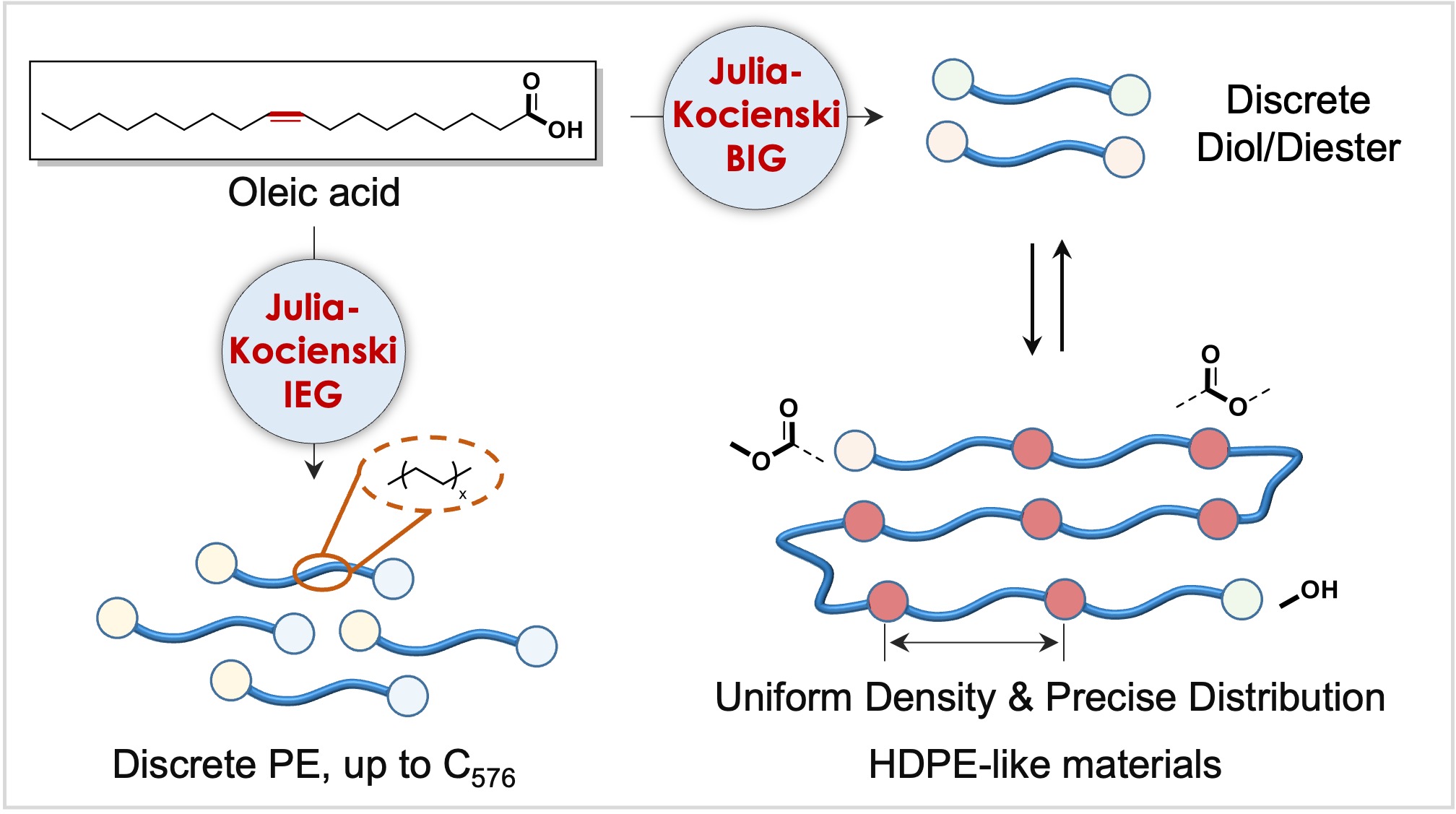 由于精准合成单一分子量高分子的挑战极高,国际上这一领域的研究很少,主要集中于聚酯、聚醚等杂链高分子,而对结构最简单的全碳主链单一分子量聚乙烯的研究鲜有报道。针对这一挑战,该团队摒弃传统合成方法,创新提出基于Julia Kocienski烯烃化反应的迭代合成策略,成功合成出纯度高于99%的单一分子量聚乙烯,链长达576个碳原子,刷新了合成纪录。团队进一步以该聚乙烯为模块,制备出酯键均一分布的类聚乙烯材料,首次明确了实现商用聚乙烯性能所需的临界链长。尤为重要的是,该材料在温和催化条件下能够定量解聚为原始单体,经多次循环再生后,模量与强度仍与初代材料相当,实现了真正意义上的闭环回收,从根本上解决了传统塑料因分子量分布波动导致的回收性能劣化问题。这一工作不仅在高分子精准合成领域取得标志性突破,也为发展高性能、可循环聚烯烃材料提供了全新的分子设计思路。这类结构精确、性能可控的可循环塑料有望引领下一代可持续材料的技术变革。