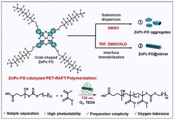 Abstract: To address the issues of low efficiency and difficult recovery of photocatalysts in near-infrared (NIR) photoinduced electron/energy transfer reversible addition–fragmentation chain transfer (PET-RAFT) polymerization, this work develops a series of fluorinated phthalocyanines to optimize the photostability and photocatalytic performance to serve as efficient and recyclable catalysts. Among them, 1H,1H-pentadecafluorooctyl-modified phthalocyanine exhibits a significantly enhanced reactive oxygen species generation efficiency and photostability, which can form submicrometer aggregates(~710 nm) in the polar solvent dimethyl sulfoxide. The zinc 2,9,16,23-tetra[(1H,1H-pentadecafluorooctyl)oxy]-phthalocyanine (ZnPc-FO)-mediated PET-RAFT polymerization can achieve high monomer conversion in the presence of oxygen within 4 h (up to 98%) and controlled polymerization (Đ ≤ 1.25). A key breakthrough lies in facilely anchoring ZnPc-FO onto the surface of a poly(tetrafluoroethylene) (PTFE) stirrer by taking advantage of unique fluorine–fluorine (F–F) interactions, which greatly simplifies the recycling operation after polymerization, and up to 90% monomer conversion can be maintained even after 12 noncontinuous cycles. This kind of fluorinated phthalocyanine provides an efficient and recyclable catalyst for NIR light-mediated PET-RAFT polymerization.