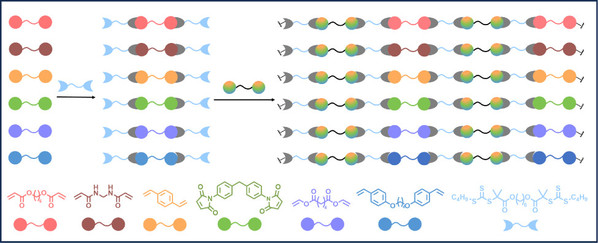 Abstract: Precise control over monomer sequence in synthetic polymers remains a central challenge in polymer chemistry, with significant implications for materials design and controlled degradation. Here, we report a modular and efficient strategy for synthesizing ABAC-type periodic terpolymers by integrating reversible addition–fragmentation chain transfer single-unit monomer insertion (RAFT-SUMI) with RAFT step-growth polymerization. Sequence-regulated oligomers are first constructed via RAFT-SUMI using bifunctional RAFT agents and vinyl monomers, then employed as bifunctional RAFT agents for step-growth polymerization with complementary vinyl monomers. The method enables precise control over polymer sequence and architecture, affording terpolymers with tunable molecular weights and thermal properties. A broad library of ABAC-type terpolymers was synthesized, exhibiting glass transition temperatures (Tg) from −28.75 to 79.75 °C and decomposition temperatures (Td) from 194.9 to 243.64 °C. Incorporation of disulfide linkages into the polymer backbone further enabled selective degradation in response to chemical stimuli, confirming the periodic nature of the sequence. This work establishes a generalizable platform for constructing precision macromolecules with programmable functionality, offering broad potential for applications in degradable materials and advanced polymer systems.