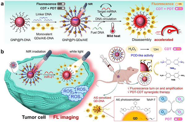 Abstract:Accurate detection of disease biomarkers in situ is essential for early cancer diagnosis and treatment. Herein, we delicately designed a multifunctional nanoprobe, GNP@Pt-QDs/AIE, for the imaging of miRNA biomarkers in living cells and tissues and image-guided synergistic cancer therapy. Using chimeric phosphodiester-phosphorothioate DNA and dual-thiol grouped aggregation-induced emission (AIE) photosensitizer as co-ligands, monovalent DNA-modified quantum dot (QD) is synthesized with strong photosensitization via efficient energy transfer between QD and the surface-coordinated photosensitizers. Through DNA-programmed assembly with a peroxidase-mimetic platinum-shelled gold nanoparticle (GNP@Pt), a core-satellite GNP@Pt-QDs/AIE nanoprobe is constructed that completely quenched both fluorescence and reactive oxygen species (ROS). Upon response to miRNA target, QDs are programmatically disassembled from the nanoprobes, leading to amplified fluorescence and photodynamic activity. Concurrently, the steric hindrance of the platinum shell is relieved with oxygen-independent chemodynamic activity restored. More significantly, the mild photothermal effect under near-infrared (NIR) irradiation can accelerate the disassembly to fast activate fluorescence and ROS output. Excellent performances in miRNA-21 target imaging and chemodynamic-photodynamic synergistic anticancer therapy are achieved in vitro and in vivo with negligible cytotoxicity. This NIR-photoaccelerable nanoprobe, capable of imaging miRNA biomarkers in situ and synergizing chemodynamic-photodynamic therapy, offers great potential for the early diagnosis and treatment of malignancies.