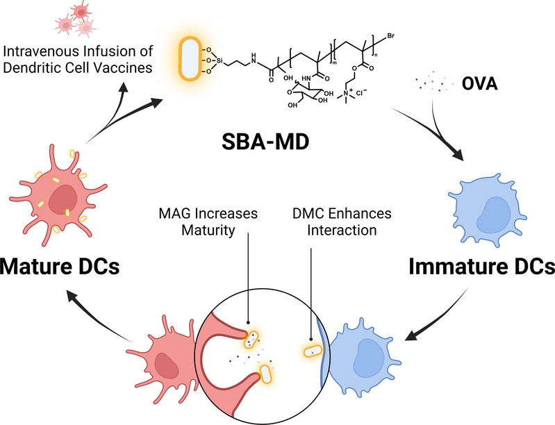Abstract: In the development of dendritic cell (DC) vaccines, the maturation of DCs is a critical stage. Adjuvants play a pivotal role in the maturation of DCs, with a major concern being to ensure both efficacy and safety. This study introduces an innovative approach that combines high efficacy with safety through the synthesis of micro-adjuvants grafted with copolymers of 2-(methacrylamido) glucopyranose (MAG) and methacryloxyethyl trimethyl ammonium chloride (DMC). The utilization of metal-free surface-initiated atom transfer radical polymerization enables the production of safe and recyclable adjuvants. These micrometer-sized adjuvants surpass the optimal size range for cellular endocytosis, enabling the retrieval and reuse of them during the ex vivo maturation process, mitigating potential toxicity concerns associated with the endocytosis of non-metabolized nanoparticles. Additionally, the adjuvants exhibit a “micro-ligand-mediated maturation enhancement” effect for DC maturation. This effect is influenced by the shape of the particle, as evidenced by the distinct promotion effects of rod-like and spherical micro-adjuvants with comparable sizes. Furthermore, the porous structure of the adjuvants enables them to function as cargo-carrying “micro-shuttles”, releasing antigens upon binding to DCs to facilitate efficient antigen delivery.